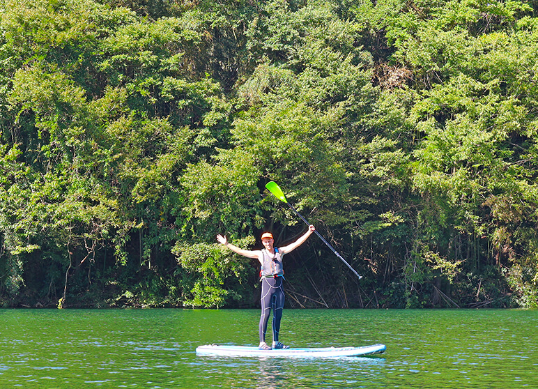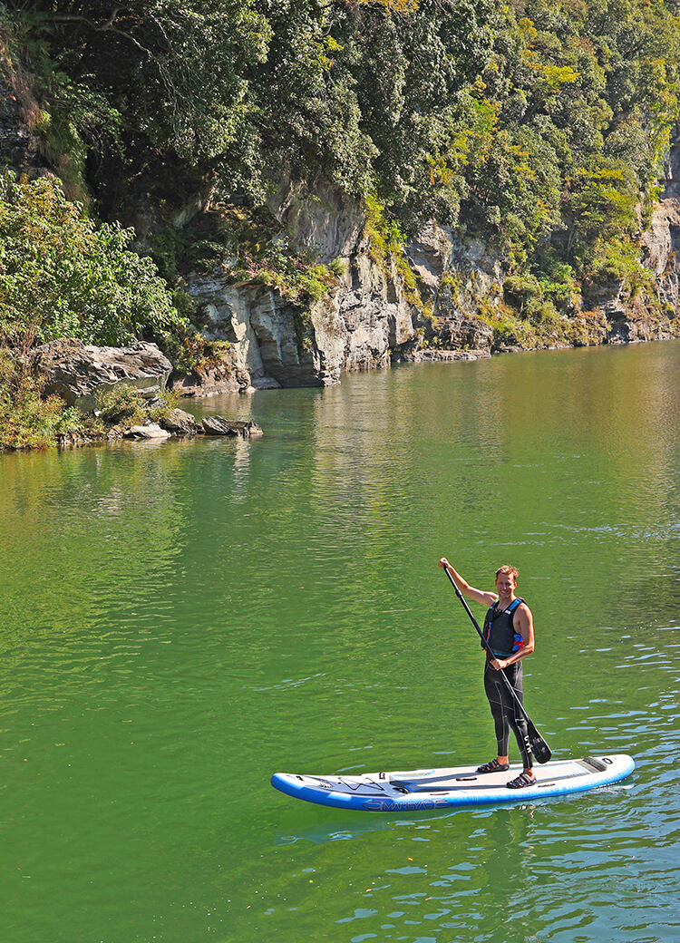 The Arakawa River that flows through the town of Nagatoro in Chichibu is known for its rapids, but there are areas where the river does not flow and becomes a lake. The lake stand-up paddleboarding experience is popular, as even first-timers can enjoy rowing in the beautiful scenery, or sit in the boat and take a break. You can also try paddling along the river with a view of Nagatoro's pavement-like rocks!