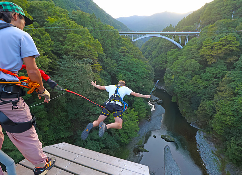 The canyon bungee at Chichibu Geo Gravity Park is Japan's first bungee jumping platform suspended only by wires. You can try a thrilling bungee jump over the Arakawa Valley, with a 360° panoramic view. The canyon walk across a suspension bridge that sways vertically and side to side is also very exciting.