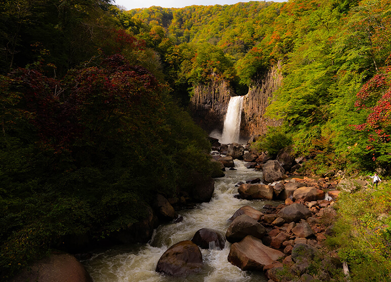 Walk along the nature-rich trail leading from Naenatakien to Naena Waterfall, which emits a large amount of negative ions. The 55-meter-high waterfall, which splashes down powerfully from a basalt wall, has been selected as one of the hundred best waterfalls in Japan.