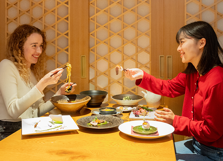 This restaurant offers a French and Italian menu with Japanese-inspired presentation. The large windows offer a framed picture-perfect view of Zenkoji Temple and Shinano. Enjoy a special course menu while taking in the relaxing view.