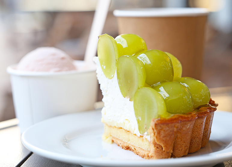 Tea time includes sweets made with fruits from the orchard. For the cake set, which is only available when dining in, choose your favorite cake from the showcase as well as a drink and gelato. The shop offers a variety of seasonal cakes as well as classic cakes such as cheesecake.