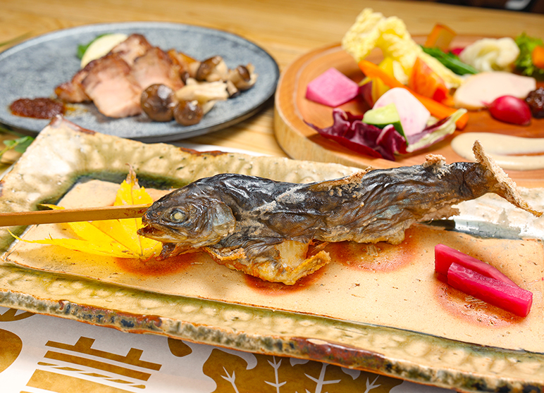 This restaurant serves "Yamabito cuisine" that makes abundant use of seasonal ingredients grown in the mountains of Okutone, bounty from the Tone River, and the nearby fields. The Irori cuisine plan, which adds Irori cuisine to the Yamabito Cuisine, allows you to enjoy specialties such as savory meat and vegetables grilled over charcoal.