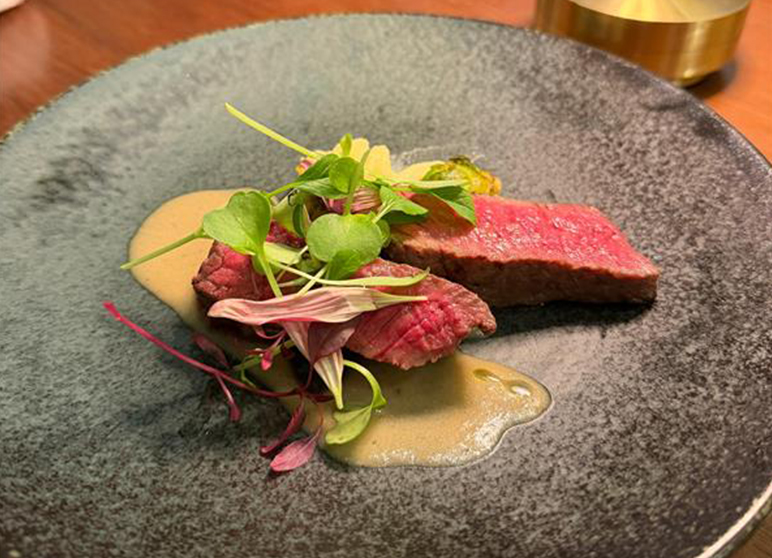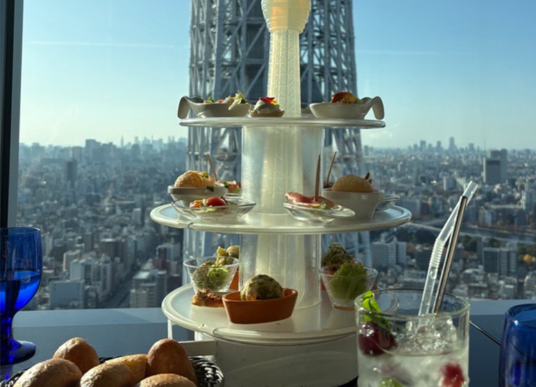 The Tenku Lounge is about 150 meters above ground, where you can enjoy a meal with the Tokyo SKYTREE® right in front of you. The "TOP LUNCH" short course features the famous "Amuse Tower," a tower of eight small appetizers, and a main dish made from seasonal fish and carefully selected Japanese beef.
