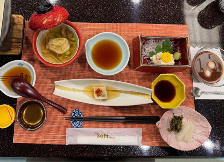 Along with Kyoto, Nikko is also known for making yuba. Yuba is the film that forms on the surface when soy milk is boiled down, and the Nikko style is to fold it in two by lifting the film up from the middle. The lunch course "yuba gozen" offers nine yuba dishes, including "hikiage yuba," which is freshly prepared yuba, simmered dishes, and tempura.