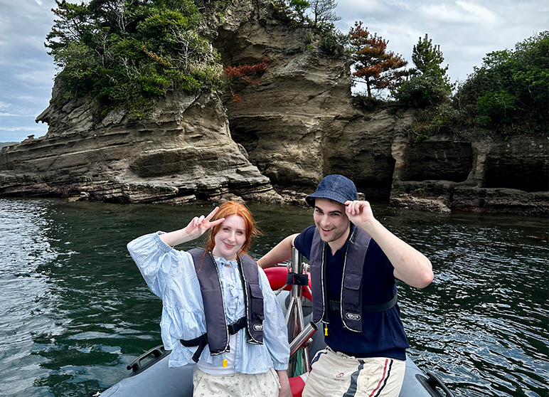 Set out by boat from Katsuura Marine Harbor and enjoy a 45-minute cruise around Katsuura Bay. Toss a prayer ball (inoridama) toward the red torii gate on Hirashima, a local "power spot" (sacred site believed to bring good fortune); visit scenic spots such as Megane Iwa(Rock) and BRACK NOSE CAPE; and experience the speed and thrill of the boat on the "GURU GURU COURSE" for some pure exhilaration!